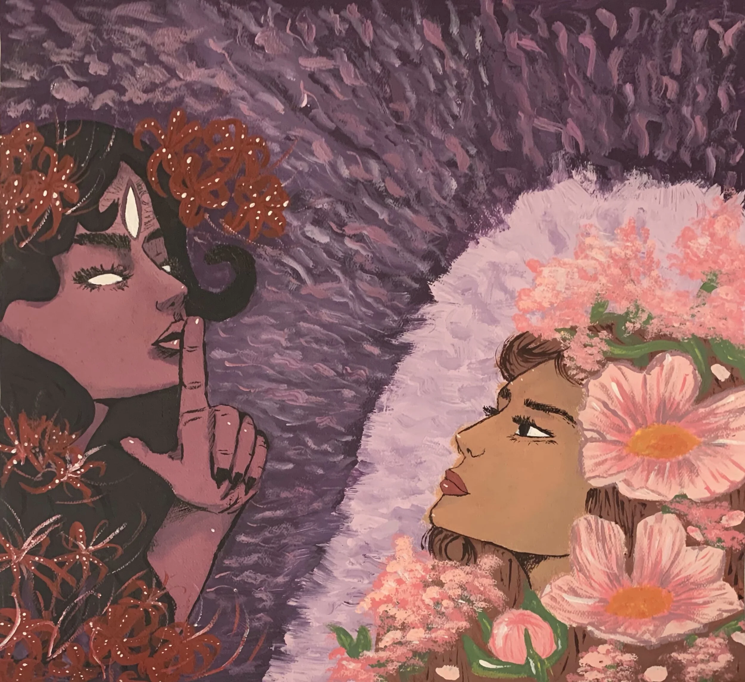 My painting was made with both paint and ink. I thought using ink would be great to add small details. My painting represents my spiritual beliefs, the woman with bright colors represents my ego. I see my ego think that they are better than everyone else, and are too likable. While my higher self has darker colors, with relaxation it looks down to my ego. My higher self shuts my ego’s thoughts, knowing that if it gets out of control, it will cause chaos. I named it Tiger Inside because sometimes in my head it feels like there's a battle and I'm a tiger trying to win.