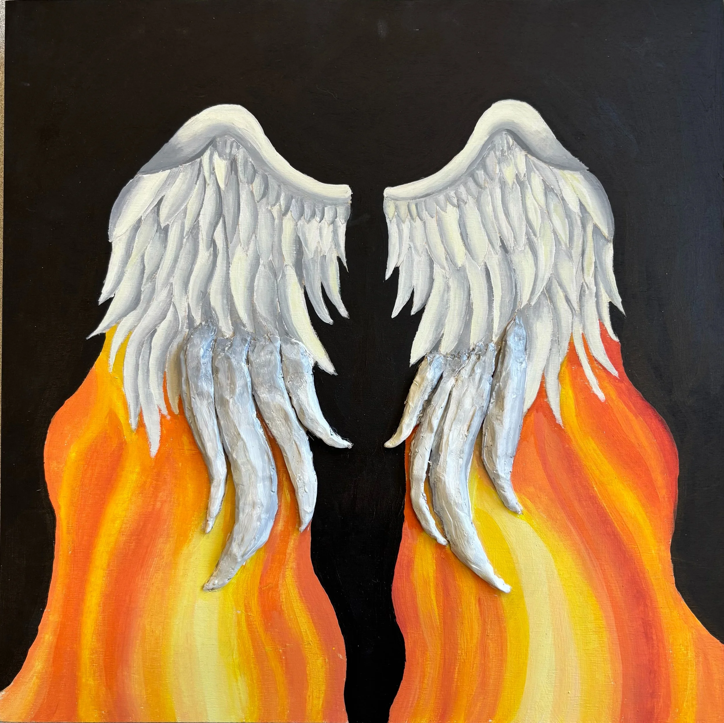 I am Derin Seyhun. I am a student at North Salinas High School. I have been creating art ever since my earliest memories. My friends and family play an important role in my creativity and inspiration. They are my biggest supporters, and I am forever grateful. I enjoy artistic movements and my favorite is the Renaissance art movement. It is the one that inspires me the most. I love that the paintings look like a picture rather than a painting. Through my art journey, I have learned that not every piece turns out the way you want, but it is in your hands to make it beautiful with your creativity and passion. One of my favorite mediums is acrylics. I chose acrylics because it reminds me of my childhood, my memories from my art class, and the joy I have for art. When I look at my piece I see two things: one is fire. The fire is representing the passion I have for art, and the wings are giving me freedom. They remind me there are no limitations in art, and I am alone with my creativity and passion. When I look at the paint flowing from the wings, I see sunshine and the warmth of the sun, representing the peace I feel when I make art. When I create art, I am free, I am in control, and I am warm. It is so peaceful that it is where I escape when I am overwhelmed.
