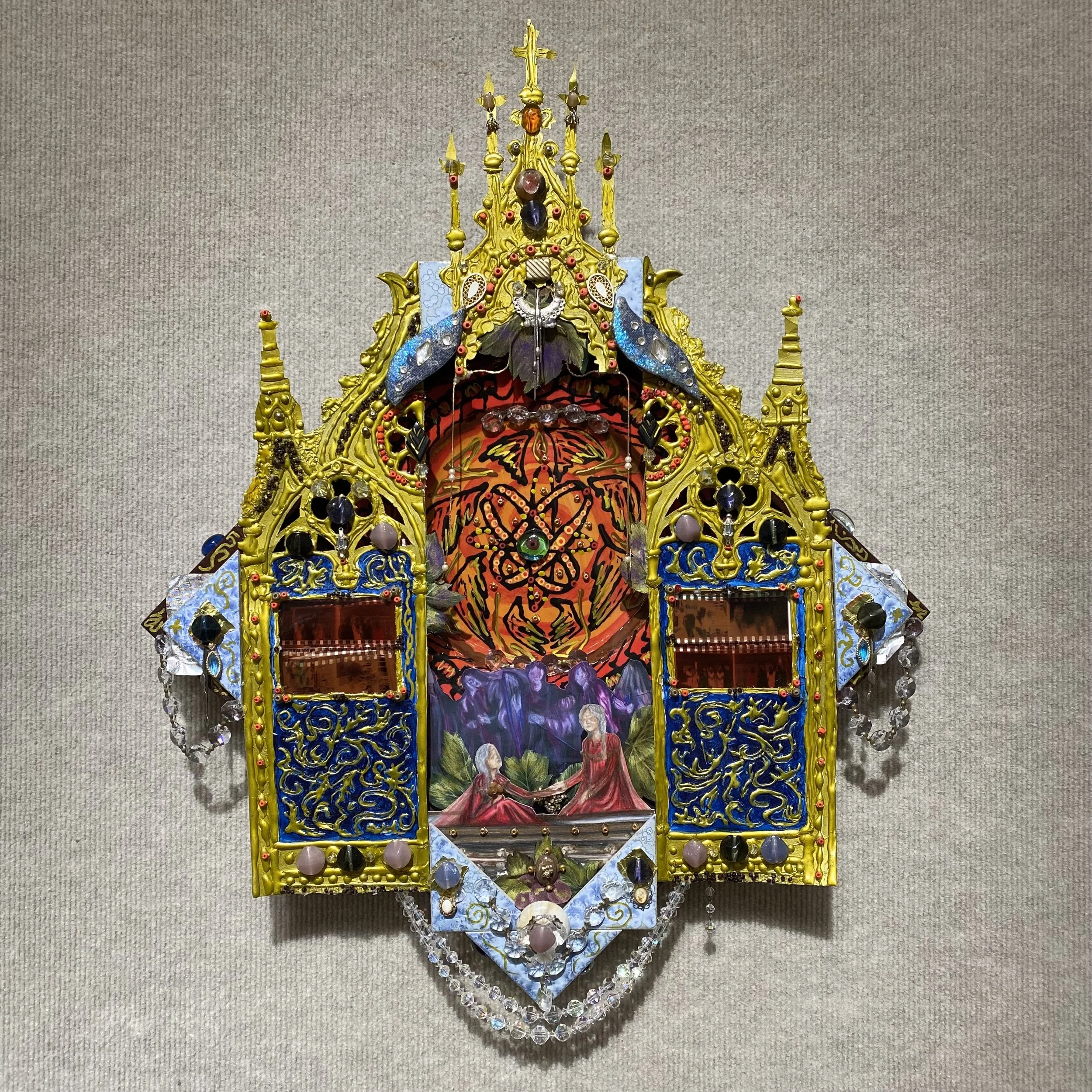 “How Many Times Must We Mourn You?” names the cruelty of dementia and the experience of grieving someone who is still alive. Every visit becomes a funeral for their former self repeated without closure or resolution, and the mourning becomes cyclical, incomplete, and inescapable. I wanted my materials to match the complexity of the topic so this piece is a combination of acrylic paint, beads, hot glue, tile, colored pencil, pastels, acrylic paint pen, foil, photo negatives, a ceramic dinner plate I painted on, fabric, skewers, mixed media paper, a 14x14 wood block. Family photographs function as stained glass windows of the chapel in which the funeral takes place, just how grief is built from the memories of love. A woman with dementia sits upright in her casket, attending her own funeral and holding her own hand, witnessing her own decline. Behind her, the family gathers in shadow, burdened by grief she cannot perceive, as she is not in mourning attire. Dementia renders her physically present, yet unreachable by the weight of what is being lost as her family grieves what she cannot name. An angel emerges in the background plate unbound by time and memory, observing without intervention as the presence of dementia seems to avert their all-seeing eyes. Even under the watchful eye of nature’s guardians there is no rescue or intervention in the truly relentless growth of dementia. The plate is painted with the complexion of fire and a futile rage towards nature and forces larger than us all. However, the spirals around the angel reflect the absurdity of nature, its inevitability, and indifference to human quandaries. Plants with flowers scattered throughout the scene are appropriate to a funeral, but these vines also consume the golden chapel doors of prosperity, flourishing green with envy for a life interrupted, spreading like an invasive weed. Encircling the angel, a centipede forms an ouroboros against a ground of red passion and rage. The ouroboros: a testament to repetition in the endless cycle of loss, and the centipede: traditionally a symbol of strength and resilience amidst hardship. Dementia destroys continuously, hereditarily, yet love grows and persists in this endless cycle alongside it within all loved ones affected. No matter how tediously my work breaks down what we know of this terrifying nature, we will never understand it, we can only try to be compassionate and understand each other. Like the grief itself, my work offers no resolution, only witnesses to many of life’s common but unseen forces, dementia, caregivers, the human will to hold on for each other, just as you witness it now.