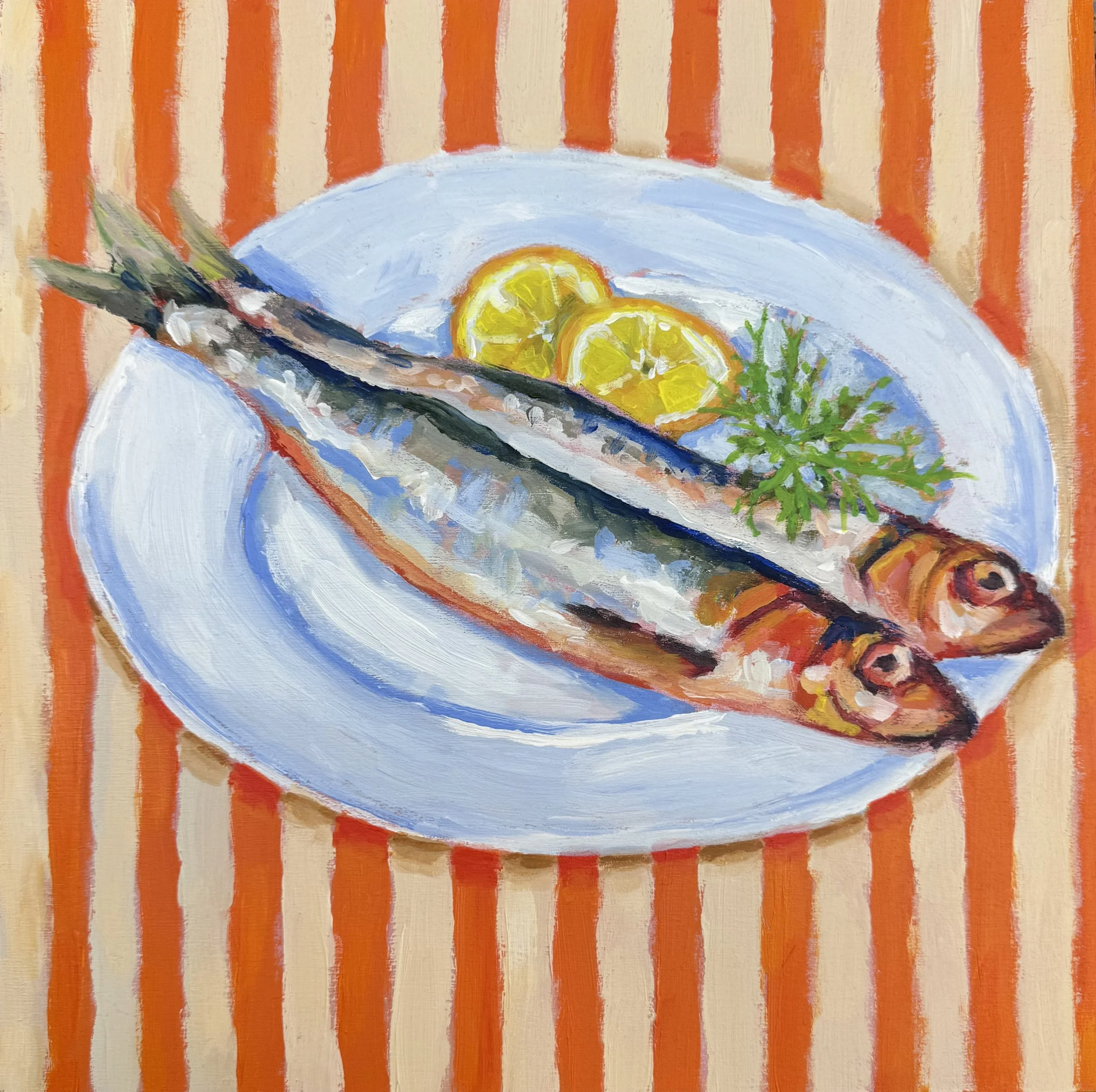 I live in Santa Cruz, but I am currently a senior at Stevenson School in Pebble Beach. Having been surrounded by the ocean my whole life, it is one of my favorite places to be, and I have found an odd interest in the beauty and human commodity of sealife. As much as I love to eat seafood, I also find the ocean and its creatures to be incredibly fascinating. I chose this year to focus on the beauty of fish and the process of how we, as humans, utilize them as food. My piece, “From Water to Table,” is one of several pieces in my portfolio this year, and it represents the death and presentation of fish as a meal.