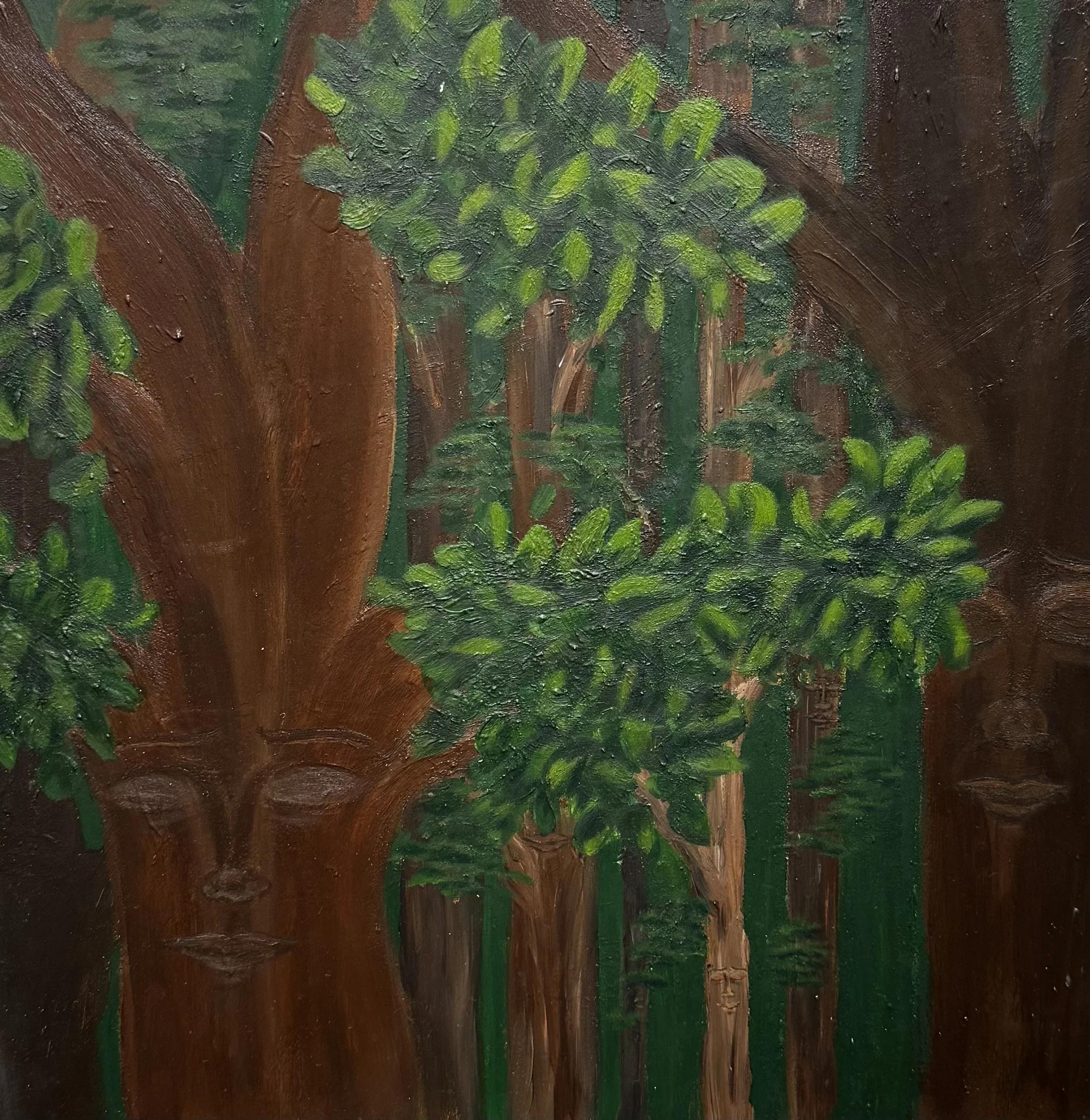 My most recent piece, “Forest of Faces” is one of my creations where I attempt to personify nature. My goal with this piece was to as this was my first time working on a wooden canvas, proving difficulties with layering and blending. The paint would dry up quicker than on stretched canvas, making it hard to blend wet paint together. I also like to layer acrylic, but on this canvas the texture of each layer was unintentionally emphasized and therefore made some parts of the painting look “busy” and distracts the viewer when it reflects the light. Nevertheless, “Forest of Faces” was one of three that I have created in which nature is given a face and expression. The calming nature of our wonderful environment is represented through the closed eyes of each tree, symbolizing compassion and understanding.